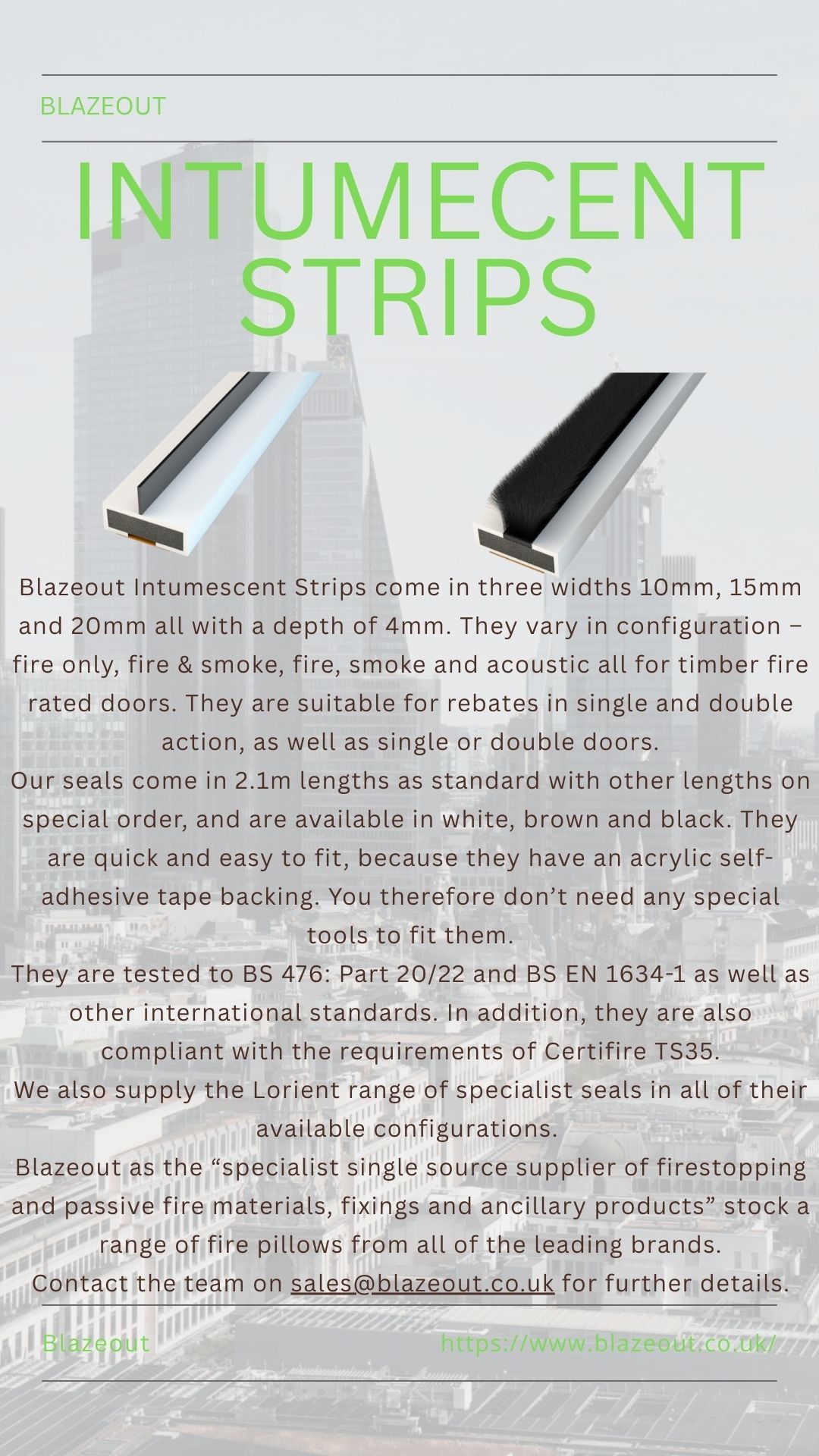 Blazeout hold a number of intumescent strips in stock, and these generally come in three widths 10mm, 15mm and 20mm all with a depth of 4mm. They vary in configuration - fire only, fire and smoke, fire, smoke and acoustic all for timber rated fire doors.